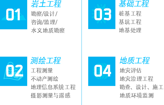 具有工程勘察綜合類甲級資質,地基與基礎施工一級資質,地質災害危險性評估甲級資質,地質災害治理勘查等資質