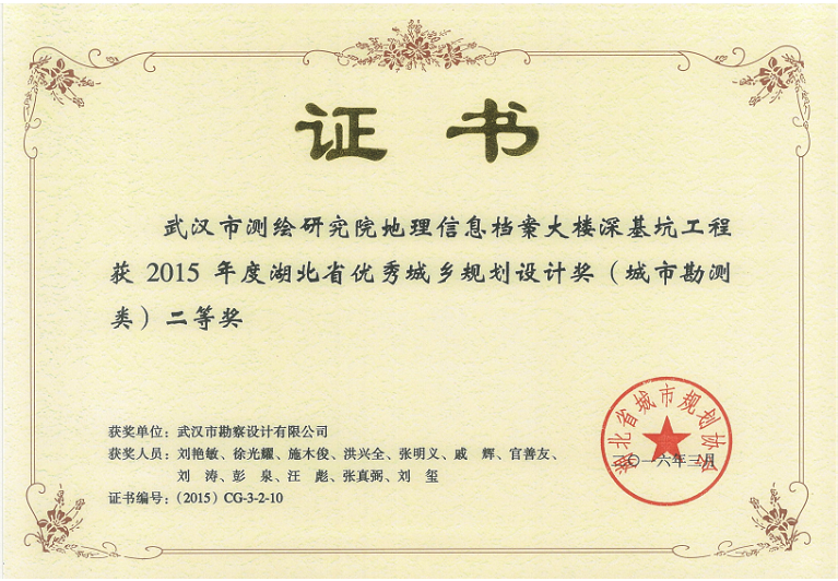 武漢市測繪研究院地理信息檔案大樓深基坑工程獲2015年度湖北省優