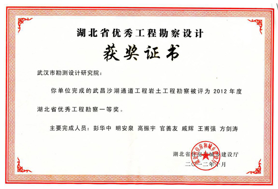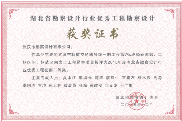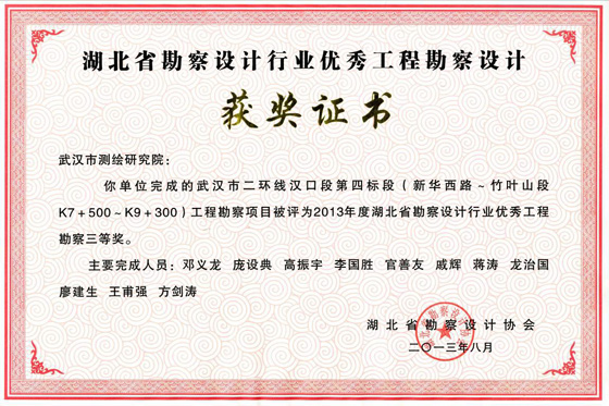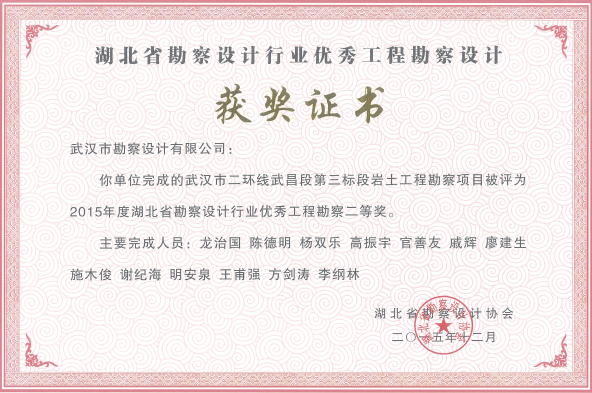 武漢市二環線武昌段第三標段巖土工程勘察項目獲2015年度湖北省勘
