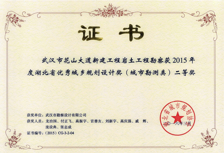 花山大道新建工程巖土工程勘察獲2015年度湖北省優秀城鄉規劃設計