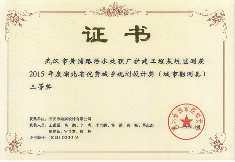 武漢市黃浦路污水處理廠擴(kuò)建工程基坑監(jiān)測獲2015年度湖北省優(yōu)秀城