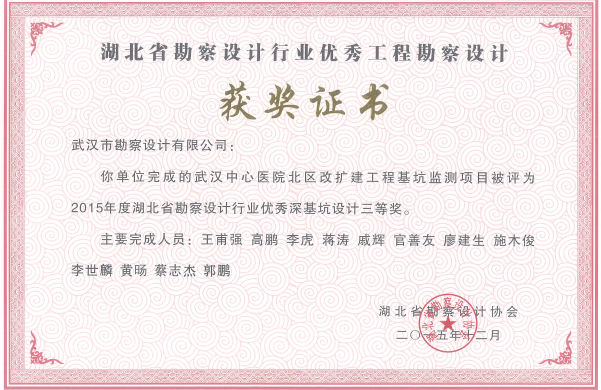 武漢中心醫(yī)院北區(qū)改擴(kuò)建工程基坑監(jiān)測項(xiàng)目獲2015年度湖北省勘察設(shè)