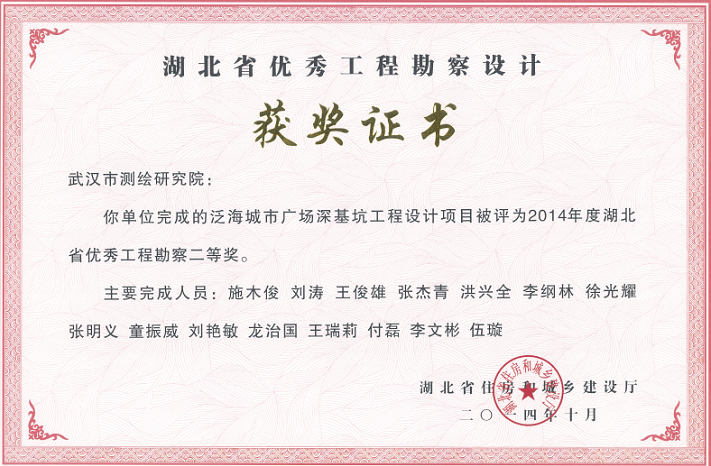 泛海城市廣場深基坑工程設(shè)計(jì)項(xiàng)目獲2014年度湖北省優(yōu)秀工程勘察二