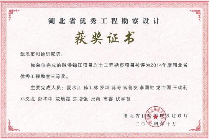融僑錦江項(xiàng)目巖土工程勘察項(xiàng)目獲2014年度湖北省優(yōu)秀工程勘察三等