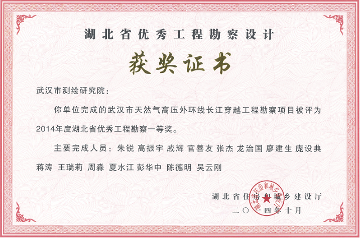 武漢市天然氣高壓外環(huán)線長江穿越工程勘察項(xiàng)目獲2014年度湖北省優(yōu)秀工程勘察一等獎(jiǎng)