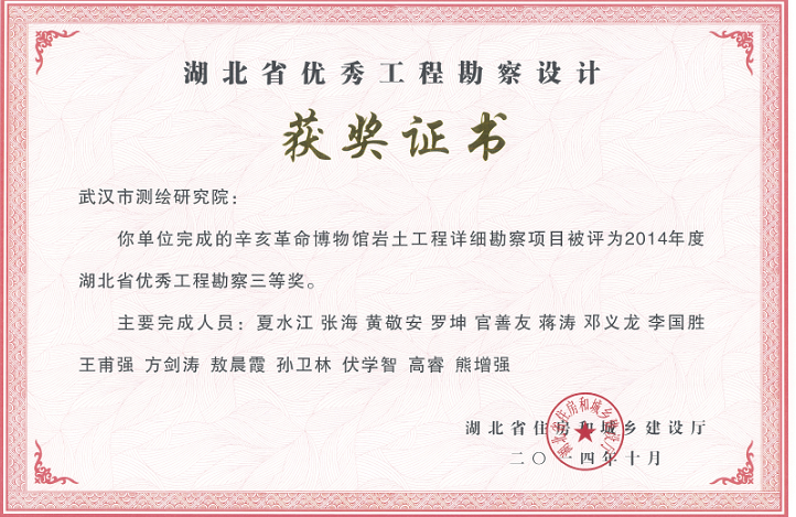 辛亥革命博物館巖土工程詳細(xì)勘察項(xiàng)目獲2014年度湖北省優(yōu)秀工程勘