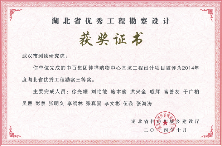 中百集團(tuán)鐘祥購物中心基坑工程設(shè)計(jì)項(xiàng)目獲2014年度湖北省優(yōu)秀工程