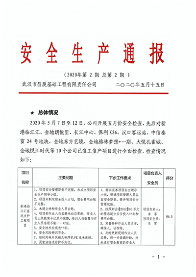 2020年5月7日至12日,昌廈公司(基礎(chǔ)工程公司)成立了安全質(zhì)量檢查組,對(duì)復(fù)工復(fù)產(chǎn)的10個(gè)基礎(chǔ)施工項(xiàng)目進(jìn)行全面安全質(zhì)量檢查,檢查按照《基礎(chǔ)工程項(xiàng)目安全生產(chǎn)工作考核評(píng)分標(biāo)準(zhǔn)》和《基礎(chǔ)工程施工質(zhì)量檢查清單》進(jìn)行對(duì)標(biāo),對(duì)每個(gè)項(xiàng)目予以評(píng)分,確保檢查的公平和公正。在安全檢查的基礎(chǔ)上,編印了《安全生產(chǎn)通報(bào)》,對(duì)每個(gè)項(xiàng)目存在的問(wèn)題、下步工作要求和考評(píng)得分情況予以公布,對(duì)公司整體安全形勢(shì)進(jìn)行分析,提出對(duì)項(xiàng)目負(fù)責(zé)人和現(xiàn)場(chǎng)安全員的獎(jiǎng)懲建議,以及下階段安全生產(chǎn)重點(diǎn)工作內(nèi)容。