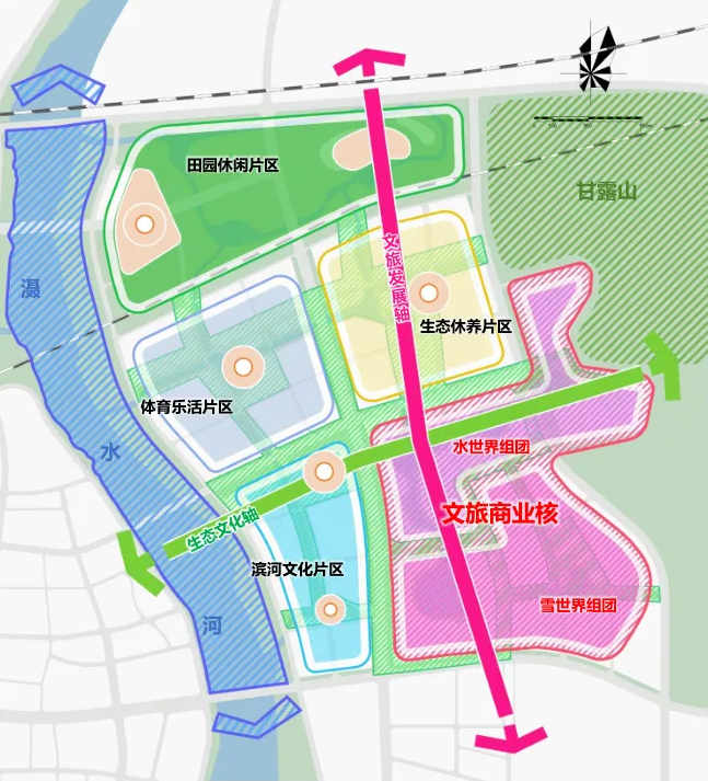 項目規劃用地約1.1萬畝,打造“一核兩軸四片區”的空間格局:項目“一核”圍繞湖面,布局多元文旅業態,其中包括約9萬方的全球最大冰雪娛樂綜合體,約2萬方的水娛樂綜合體,約30萬方的酒店康養民宿群以及集萃黃陂人文的特色水鎮商街;“兩軸”將建設文旅發展軸和生態文化軸;“四片區”即以水系為主線,形成濱河文化、體育樂活、田園休閑、生態休養四大片區,為游客提供全天候、全季節、全齡段、全業態的文化旅游服務。