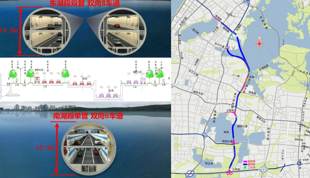 為更好地支撐城市空間發(fā)展,武漢市“十三五”規(guī)劃中要求“加大地下空間開(kāi)發(fā)利用度,加強(qiáng)地下通道、地下停車場(chǎng)等地下交通設(shè)施建設(shè),啟動(dòng)實(shí)施‘負(fù)高架’工程,改善交通出行條件”。兩湖隧道作為世界上規(guī)模最大的城市湖底雙層超大直徑隧道,是武漢市重點(diǎn)市政工程,也是惠及武漢千家萬(wàn)戶的重大民生工程。項(xiàng)目建成后,將在武昌片區(qū)形成一條南北向快速通道,可有效緩解二環(huán)線、珞獅南路、水果湖隧道等道路交通壓力,不斷完善區(qū)域路網(wǎng)體系,方便周邊地區(qū)居民出行。