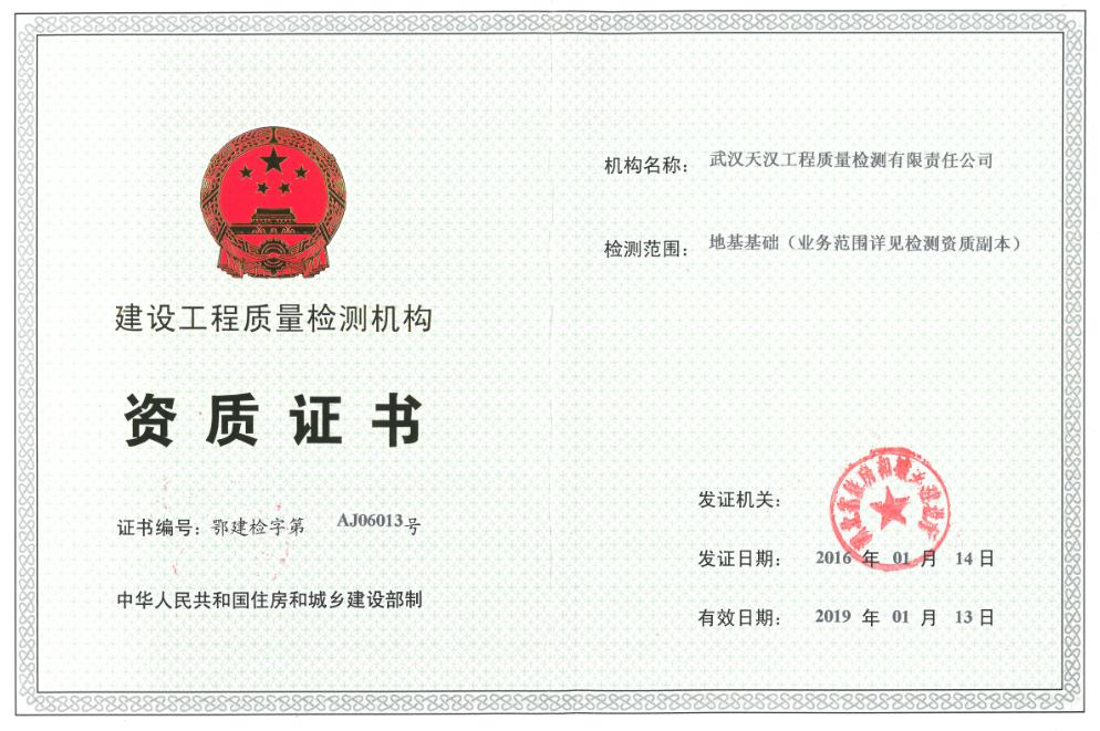 在公司領(lǐng)導(dǎo)的指導(dǎo)關(guān)心下,2016年1月14日,武漢天漢工程質(zhì)量檢測(cè)有限責(zé)任公司順利通過省住建廳資質(zhì)延期換證工作,并于2016年1月27日順利完成檢測(cè)資質(zhì)增加檢測(cè)參數(shù)工作。本次主要增加了建(構(gòu))筑物變形監(jiān)測(cè)及基坑監(jiān)測(cè)等檢測(cè)參數(shù),為天漢檢測(cè)公司大力拓展變形監(jiān)測(cè)類業(yè)務(wù)墊定了堅(jiān)實(shí)的基礎(chǔ)。(檢測(cè)測(cè)試中心)