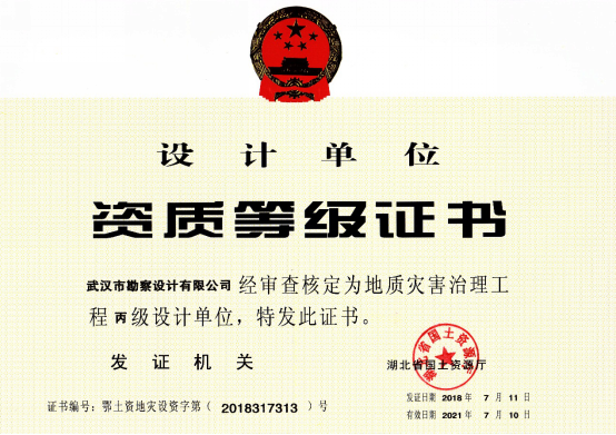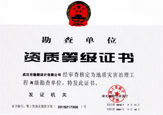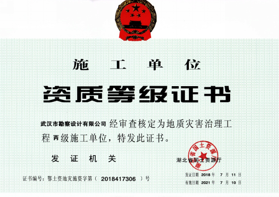 近日,湖北省國土資源廳發布了關于2018年度地質災害危險性評估和治理工程資質(新立、升級)審批結果的公告,公司地質災害危險性評估和地質災害治理工程勘查、設計、施工資質申請一次性順利通過國土資源部審核,并成功取得了資質證書。