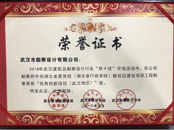 公司自接到評選通知后按照評選要求積極準備參選材料,經過層層篩選及最終的專家評審,我司東湖分公司經理付正飛榮獲優秀建設者(武漢地區),巖土工程二公司—中共湖北省委黨校(湖北省行政學院)新校區建設項目工程勘察項目榮獲優秀創新項目(武漢地區)。