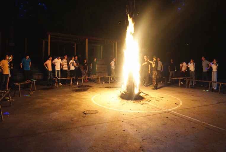 簡單的軍訓結束后,拓展活動隨即拉開帷幕,教練向大家詳細講解了本次拓展活動的要求和具體規則,以輕松有趣的熱身方式對隊員進行了分組,分別制定了隊名及口號,并進行了團隊建設、團隊融合和團隊展示。在5名教練的指導下,隊員們攻堅克難,不斷挑戰自我、突破自我,先后完成了“風雨戰士”、“信任背摔”、“穿越電網”等團隊游戲;顒又,各隊隊員全心投入,充分調動自己的靈感和創造性,積極獻言獻策,協作完成了項目設置的層層挑戰,掌聲、笑聲和歡呼聲此起彼伏。當晚,一場精彩的篝火晚會在月夜下拉開帷幕,隊員們手拉手圍著篝火,隨音樂起舞。來自各部門的“文藝骨干”即興表演,引得掌聲不斷,歡呼不歇。