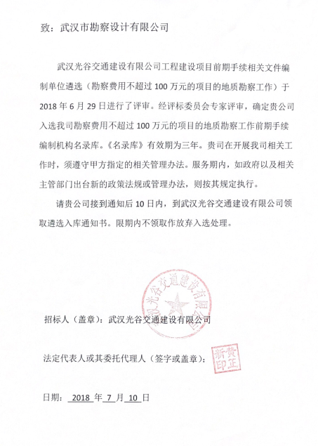 2018年6月29日,經(jīng)投標(biāo),我公司成功入選武漢光谷交通建設(shè)有限公司勘察費(fèi)用不超過100萬元的項(xiàng)目地質(zhì)勘察工作,服務(wù)期限為三年。 武漢光谷交通建設(shè)有限公司主要業(yè)務(wù)范圍為城市地鐵、有軌電車、公交系統(tǒng)等公共交通項(xiàng)目的建設(shè)、運(yùn)營(yíng)管理;重大交通建設(shè)項(xiàng)目、重大...